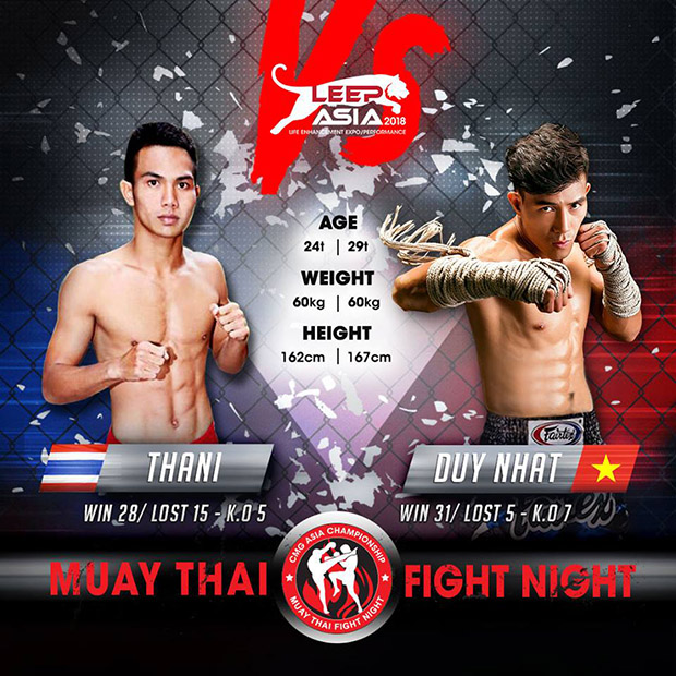 Nhiều cặp trận đấu diễn ra căng thẳng và gay cấn đã khiến người hâm mộ cảm thấy rất mãn nhãn. Các võ sĩ đã thi đấu rât nhiệt huyết và để lại ấn tượng đẹp trong lòng người xem. Trong đó cặp trận đấu được mong chờ nhất chính là: Thani (Thái Lan) thi đấu cùng Độc cô cầu bại – Nguyễn Trần Duy Nhât (Việt Nam). Võ sĩ Việt Nam được mệnh danh là không có đối thủ tại đấu trường khu vực và là nhà đương kim Vô địch Muay Thai Thế giới. Đây được xem là cặp trận đấu làm bùng nổ nhà thi đấu Nguyễn Du bởi trình độ ngang tài, ngang sức của hai võ sĩ. Không phụ lòng mong mỏi của người hâm mộ, hai võ sĩ đã cống hiến một lối đánh đầy kĩ thuật và lôi cuốn. Với kinh nghiệm dày dặn trên các đấu trường quốc tế, Nguyễn Trần Duy Nhất đã dành chiến thắng chung cuộc với tỉ số 30-27, khép lại một đêm Muay Thai Fight Night mãn nhãn và quyết liệt.
